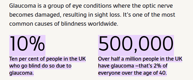 Glaucoma is one of the leading causes of irreversible blindness; however, with early detection and appropriate management, most patients can preserve their sight and quality of life. Over half a million people in the UK have glaucoma, a number predicted to increase with an aging population. Ten percent of people in the UK who go blind do so due to glaucoma.